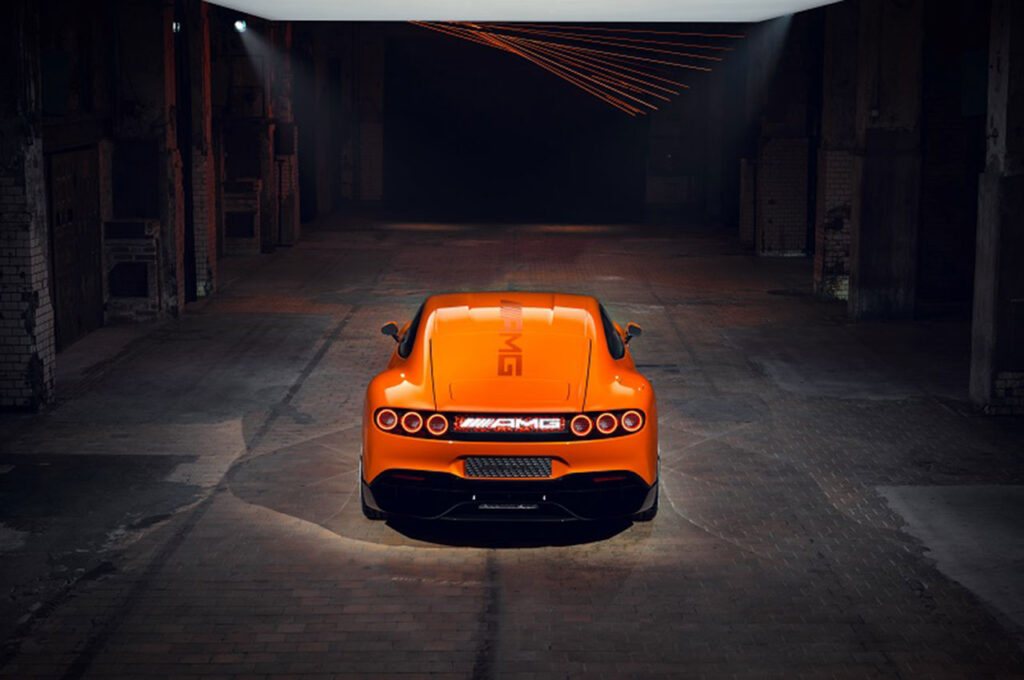 Kuşbakışı bakıldığında, akıcı tavan çizgisinin arkaya doğru daralarak geniş omuz hatlarına olanak tanıdığı görülüyor. Arka çamurluklar da yan yüzeylerden organik bir şekilde akarak şekilleniyor. Arka bölümde öne çıkan bir diğer tasarım öğesi ise, her iki yanda derinlemesine alçalan görünür karbon fiberden geniş difüzör. Yüksek hızlarda arka kararlılığı sağlamak üzere tasarlanan bu yapı, formuyla AMG ONE’ı anımsatıyor.